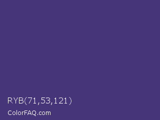 RYB 71,53,121 Color is a normal indigo color and the nearest color is Minsk #3f307f. Hex code #473579 and RGB value is rgb(71,53,121). In RGB color space, this color is composed of 28% red, 21% green, 47% blue, In CMYK color space, this color is composed of 41% cyan, 56% magenta, 0% yellow , 53% black , In HSL color space, this color has a hue angle of 256° , 39% saturation and 34% lightness.