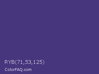 RYB 71,53,125 Color is a normal indigo color and the nearest color is Minsk #3f307f. Hex code #47357d and RGB value is rgb(71,53,125). In RGB color space, this color is composed of 28% red, 21% green, 49% blue, In CMYK color space, this color is composed of 43% cyan, 58% magenta, 0% yellow , 51% black , In HSL color space, this color has a hue angle of 255° , 40% saturation and 35% lightness.