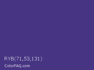 RYB 71,53,131 Color is a normal indigo color and the nearest color is Minsk #3f307f. Hex code #473583 and RGB value is rgb(71,53,131). In RGB color space, this color is composed of 28% red, 21% green, 51% blue, In CMYK color space, this color is composed of 46% cyan, 60% magenta, 0% yellow , 49% black , In HSL color space, this color has a hue angle of 254° , 42% saturation and 36% lightness.
