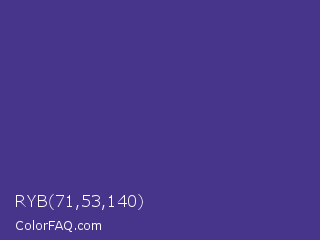 RYB 71,53,140 Color is a normal indigo color and the nearest color is Dark Slate Blue #483d8b. Hex code #47358c and RGB value is rgb(71,53,140). In RGB color space, this color is composed of 28% red, 21% green, 55% blue, In CMYK color space, this color is composed of 49% cyan, 62% magenta, 0% yellow , 45% black , In HSL color space, this color has a hue angle of 252° , 45% saturation and 38% lightness.