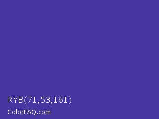 RYB 71,53,161 Color is a normal indigo color and the nearest color is Gigas #523c94. Hex code #4735a1 and RGB value is rgb(71,53,161). In RGB color space, this color is composed of 28% red, 21% green, 63% blue, In CMYK color space, this color is composed of 56% cyan, 67% magenta, 0% yellow , 37% black , In HSL color space, this color has a hue angle of 250° , 50% saturation and 42% lightness.