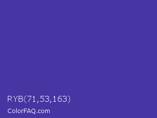 RYB 71,53,163 Color is a normal indigo color and the nearest color is Gigas #523c94. Hex code #4735a3 and RGB value is rgb(71,53,163). In RGB color space, this color is composed of 28% red, 21% green, 64% blue, In CMYK color space, this color is composed of 56% cyan, 67% magenta, 0% yellow , 36% black , In HSL color space, this color has a hue angle of 250° , 51% saturation and 42% lightness.