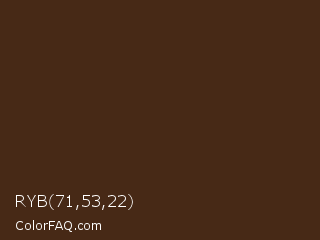 RYB 71,53,22 Color is a very dark orange color and the nearest color is Brown Derby #492615. Hex code #472916 and RGB value is rgb(71,41,22). In RGB color space, this color is composed of 28% red, 16% green, 9% blue, In CMYK color space, this color is composed of 0% cyan, 42% magenta, 69% yellow , 72% black , In HSL color space, this color has a hue angle of 23° , 53% saturation and 18% lightness.