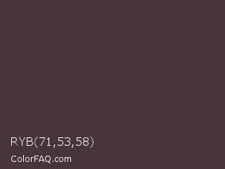RYB 71,53,58 Color is a dark rose color and the nearest color is Masala #403b38. Hex code #47353a and RGB value is rgb(71,53,58). In RGB color space, this color is composed of 28% red, 21% green, 23% blue, In CMYK color space, this color is composed of 0% cyan, 25% magenta, 18% yellow , 72% black , In HSL color space, this color has a hue angle of 343° , 15% saturation and 24% lightness.