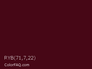 RYB 71,7,22 Color is a very dark red color and the nearest color is Cab Sav #4d0a18. Hex code #470716 and RGB value is rgb(71,7,22). In RGB color space, this color is composed of 28% red, 3% green, 9% blue, In CMYK color space, this color is composed of 0% cyan, 90% magenta, 69% yellow , 72% black , In HSL color space, this color has a hue angle of 346° , 82% saturation and 15% lightness.
