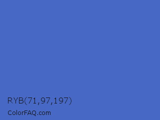 RYB 71,97,197 Color is a normal blue color and the nearest color is Indigo #4f69c6. Hex code #4768c5 and RGB value is rgb(71,104,197). In RGB color space, this color is composed of 28% red, 41% green, 77% blue, In CMYK color space, this color is composed of 64% cyan, 47% magenta, 0% yellow , 23% black , In HSL color space, this color has a hue angle of 224° , 52% saturation and 53% lightness.