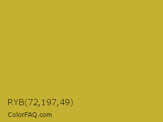 RYB 72,197,49 Color is a normal yellow color and the nearest color is Earls Green #c9b93b. Hex code #c5b131 and RGB value is rgb(197,177,49). In RGB color space, this color is composed of 77% red, 69% green, 19% blue, In CMYK color space, this color is composed of 0% cyan, 10% magenta, 75% yellow , 23% black , In HSL color space, this color has a hue angle of 52° , 60% saturation and 48% lightness.