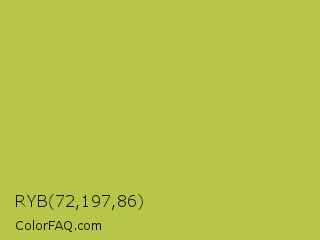 RYB 72,197,86 Color is a normal yellow color and the nearest color is Celery #b8c25d. Hex code #b7c548 and RGB value is rgb(183,197,72). In RGB color space, this color is composed of 72% red, 77% green, 28% blue, In CMYK color space, this color is composed of 7% cyan, 0% magenta, 63% yellow , 23% black , In HSL color space, this color has a hue angle of 67° , 52% saturation and 53% lightness.