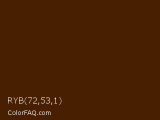 RYB 72,53,1 Color is a very dark orange color and the nearest color is Morocco Brown #441d00. Hex code #481f01 and RGB value is rgb(72,31,1). In RGB color space, this color is composed of 28% red, 12% green, 0% blue, In CMYK color space, this color is composed of 0% cyan, 57% magenta, 99% yellow , 72% black , In HSL color space, this color has a hue angle of 25° , 97% saturation and 14% lightness.