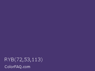 RYB 72,53,113 Color is a normal indigo color and the nearest color is Minsk #3f307f. Hex code #483571 and RGB value is rgb(72,53,113). In RGB color space, this color is composed of 28% red, 21% green, 44% blue, In CMYK color space, this color is composed of 36% cyan, 53% magenta, 0% yellow , 56% black , In HSL color space, this color has a hue angle of 259° , 36% saturation and 33% lightness.