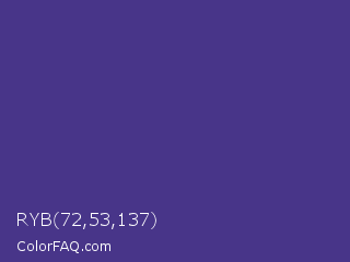RYB 72,53,137 Color is a normal indigo color and the nearest color is Dark Slate Blue #483d8b. Hex code #483589 and RGB value is rgb(72,53,137). In RGB color space, this color is composed of 28% red, 21% green, 54% blue, In CMYK color space, this color is composed of 47% cyan, 61% magenta, 0% yellow , 46% black , In HSL color space, this color has a hue angle of 254° , 44% saturation and 37% lightness.