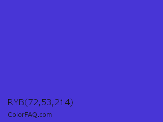RYB 72,53,214 Color is a normal indigo color and the nearest color is Iris #5a4fcf. Hex code #4835d6 and RGB value is rgb(72,53,214). In RGB color space, this color is composed of 28% red, 21% green, 84% blue, In CMYK color space, this color is composed of 66% cyan, 75% magenta, 0% yellow , 16% black , In HSL color space, this color has a hue angle of 247° , 66% saturation and 52% lightness.