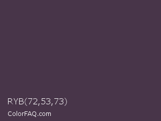 RYB 72,53,73 Color is a dark magenta color and the nearest color is Matterhorn #4e3b41. Hex code #483549 and RGB value is rgb(72,53,73). In RGB color space, this color is composed of 28% red, 21% green, 29% blue, In CMYK color space, this color is composed of 1% cyan, 27% magenta, 0% yellow , 71% black , In HSL color space, this color has a hue angle of 297° , 16% saturation and 25% lightness.