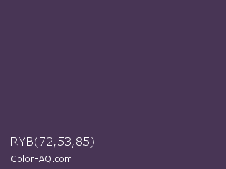 RYB 72,53,85 Color is a dark purple color and the nearest color is Voodoo #533455. Hex code #483555 and RGB value is rgb(72,53,85). In RGB color space, this color is composed of 28% red, 21% green, 33% blue, In CMYK color space, this color is composed of 15% cyan, 38% magenta, 0% yellow , 67% black , In HSL color space, this color has a hue angle of 276° , 23% saturation and 27% lightness.