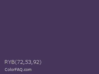 RYB 72,53,92 Color is a dark violet color and the nearest color is Bossanova #4e2a5a. Hex code #48355c and RGB value is rgb(72,53,92). In RGB color space, this color is composed of 28% red, 21% green, 36% blue, In CMYK color space, this color is composed of 22% cyan, 42% magenta, 0% yellow , 64% black , In HSL color space, this color has a hue angle of 269° , 27% saturation and 28% lightness.