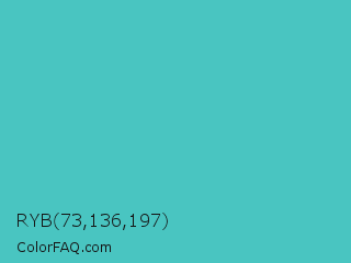 RYB 73,136,197 Color is a normal cyan color and the nearest color is Sea Serpent #4bc7cf. Hex code #49c5c1 and RGB value is rgb(73,197,193). In RGB color space, this color is composed of 29% red, 77% green, 76% blue, In CMYK color space, this color is composed of 63% cyan, 0% magenta, 2% yellow , 23% black , In HSL color space, this color has a hue angle of 178° , 52% saturation and 53% lightness.