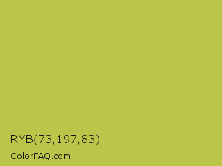 RYB 73,197,83 Color is a normal yellow color and the nearest color is Turmeric #cabb48. Hex code #bbc549 and RGB value is rgb(187,197,73). In RGB color space, this color is composed of 73% red, 77% green, 29% blue, In CMYK color space, this color is composed of 5% cyan, 0% magenta, 63% yellow , 23% black , In HSL color space, this color has a hue angle of 65° , 52% saturation and 53% lightness.