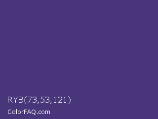 RYB 73,53,121 Color is a normal indigo color and the nearest color is Minsk #3f307f. Hex code #493579 and RGB value is rgb(73,53,121). In RGB color space, this color is composed of 29% red, 21% green, 47% blue, In CMYK color space, this color is composed of 40% cyan, 56% magenta, 0% yellow , 53% black , In HSL color space, this color has a hue angle of 258° , 39% saturation and 34% lightness.