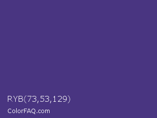 RYB 73,53,129 Color is a normal indigo color and the nearest color is Minsk #3f307f. Hex code #493581 and RGB value is rgb(73,53,129). In RGB color space, this color is composed of 29% red, 21% green, 51% blue, In CMYK color space, this color is composed of 43% cyan, 59% magenta, 0% yellow , 49% black , In HSL color space, this color has a hue angle of 256° , 42% saturation and 36% lightness.
