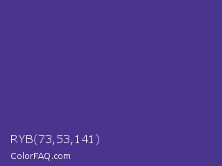 RYB 73,53,141 Color is a normal indigo color and the nearest color is Dark Slate Blue #483d8b. Hex code #49358d and RGB value is rgb(73,53,141). In RGB color space, this color is composed of 29% red, 21% green, 55% blue, In CMYK color space, this color is composed of 48% cyan, 62% magenta, 0% yellow , 45% black , In HSL color space, this color has a hue angle of 254° , 45% saturation and 38% lightness.