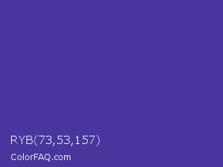 RYB 73,53,157 Color is a normal indigo color and the nearest color is Gigas #523c94. Hex code #49359d and RGB value is rgb(73,53,157). In RGB color space, this color is composed of 29% red, 21% green, 62% blue, In CMYK color space, this color is composed of 54% cyan, 66% magenta, 0% yellow , 38% black , In HSL color space, this color has a hue angle of 252° , 50% saturation and 41% lightness.