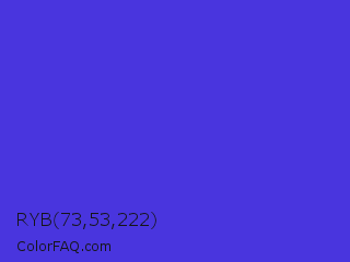 RYB 73,53,222 Color is a normal indigo color and the nearest color is Iris #5a4fcf. Hex code #4935de and RGB value is rgb(73,53,222). In RGB color space, this color is composed of 29% red, 21% green, 87% blue, In CMYK color space, this color is composed of 67% cyan, 76% magenta, 0% yellow , 13% black , In HSL color space, this color has a hue angle of 247° , 72% saturation and 54% lightness.
