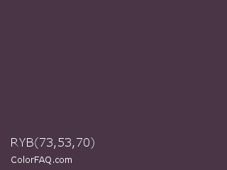RYB 73,53,70 Color is a dark magenta color and the nearest color is Matterhorn #4e3b41. Hex code #493546 and RGB value is rgb(73,53,70). In RGB color space, this color is composed of 29% red, 21% green, 27% blue, In CMYK color space, this color is composed of 0% cyan, 27% magenta, 4% yellow , 71% black , In HSL color space, this color has a hue angle of 309° , 16% saturation and 25% lightness.
