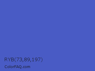 RYB 73,89,197 Color is a normal blue color and the nearest color is Indigo #4f69c6. Hex code #495bc5 and RGB value is rgb(73,91,197). In RGB color space, this color is composed of 29% red, 36% green, 77% blue, In CMYK color space, this color is composed of 63% cyan, 54% magenta, 0% yellow , 23% black , In HSL color space, this color has a hue angle of 231° , 52% saturation and 53% lightness.