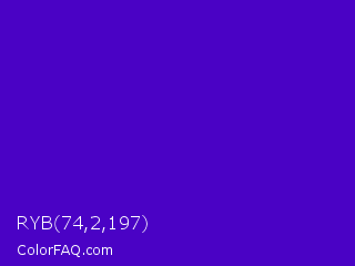 RYB 74,2,197 Color is a normal violet color and the nearest color is Interdimensional Blue #360ccc. Hex code #4a02c5 and RGB value is rgb(74,2,197). In RGB color space, this color is composed of 29% red, 1% green, 77% blue, In CMYK color space, this color is composed of 62% cyan, 99% magenta, 0% yellow , 23% black , In HSL color space, this color has a hue angle of 262° , 98% saturation and 39% lightness.