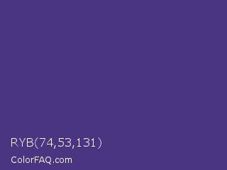 RYB 74,53,131 Color is a normal indigo color and the nearest color is Dark Slate Blue #483d8b. Hex code #4a3583 and RGB value is rgb(74,53,131). In RGB color space, this color is composed of 29% red, 21% green, 51% blue, In CMYK color space, this color is composed of 44% cyan, 60% magenta, 0% yellow , 49% black , In HSL color space, this color has a hue angle of 256° , 42% saturation and 36% lightness.