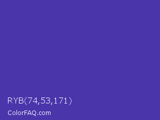 RYB 74,53,171 Color is a normal indigo color and the nearest color is Ocean Blue #4f42b5. Hex code #4a35ab and RGB value is rgb(74,53,171). In RGB color space, this color is composed of 29% red, 21% green, 67% blue, In CMYK color space, this color is composed of 57% cyan, 69% magenta, 0% yellow , 33% black , In HSL color space, this color has a hue angle of 251° , 53% saturation and 44% lightness.
