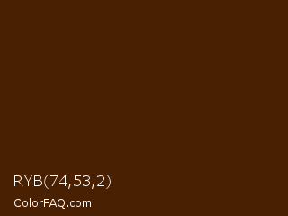 RYB 74,53,2 Color is a very dark orange color and the nearest color is Indian Tan #4d1e01. Hex code #4a2002 and RGB value is rgb(74,32,2). In RGB color space, this color is composed of 29% red, 13% green, 1% blue, In CMYK color space, this color is composed of 0% cyan, 57% magenta, 97% yellow , 71% black , In HSL color space, this color has a hue angle of 25° , 95% saturation and 15% lightness.