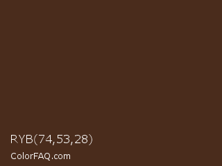 RYB 74,53,28 Color is a very dark orange color and the nearest color is Saddle #4c3024. Hex code #4a2c1c and RGB value is rgb(74,44,28). In RGB color space, this color is composed of 29% red, 17% green, 11% blue, In CMYK color space, this color is composed of 0% cyan, 41% magenta, 62% yellow , 71% black , In HSL color space, this color has a hue angle of 21° , 45% saturation and 20% lightness.