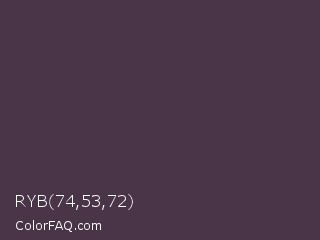 RYB 74,53,72 Color is a dark magenta color and the nearest color is Matterhorn #4e3b41. Hex code #4a3548 and RGB value is rgb(74,53,72). In RGB color space, this color is composed of 29% red, 21% green, 28% blue, In CMYK color space, this color is composed of 0% cyan, 28% magenta, 3% yellow , 71% black , In HSL color space, this color has a hue angle of 306° , 17% saturation and 25% lightness.