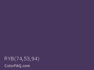 RYB 74,53,94 Color is a dark purple color and the nearest color is Bossanova #4e2a5a. Hex code #4a355e and RGB value is rgb(74,53,94). In RGB color space, this color is composed of 29% red, 21% green, 37% blue, In CMYK color space, this color is composed of 21% cyan, 44% magenta, 0% yellow , 63% black , In HSL color space, this color has a hue angle of 271° , 28% saturation and 29% lightness.