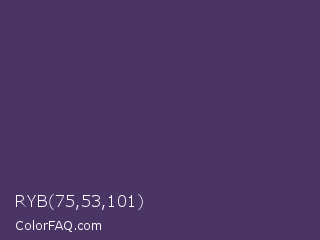 RYB 75,53,101 Color is a dark violet color and the nearest color is Bossanova #4e2a5a. Hex code #4b3565 and RGB value is rgb(75,53,101). In RGB color space, this color is composed of 29% red, 21% green, 40% blue, In CMYK color space, this color is composed of 26% cyan, 48% magenta, 0% yellow , 60% black , In HSL color space, this color has a hue angle of 268° , 31% saturation and 30% lightness.
