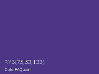 RYB 75,53,133 Color is a normal indigo color and the nearest color is Dark Slate Blue #483d8b. Hex code #4b3585 and RGB value is rgb(75,53,133). In RGB color space, this color is composed of 29% red, 21% green, 52% blue, In CMYK color space, this color is composed of 44% cyan, 60% magenta, 0% yellow , 48% black , In HSL color space, this color has a hue angle of 257° , 43% saturation and 36% lightness.