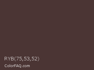 RYB 75,53,52 Color is a dark red color and the nearest color is Rock #4d3833. Hex code #4b3534 and RGB value is rgb(75,53,52). In RGB color space, this color is composed of 29% red, 21% green, 20% blue, In CMYK color space, this color is composed of 0% cyan, 29% magenta, 31% yellow , 71% black , In HSL color space, this color has a hue angle of 3° , 18% saturation and 25% lightness.