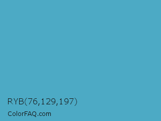 RYB 76,129,197 Color is a normal cyan color and the nearest color is Maximum Blue #47abcc. Hex code #4caac5 and RGB value is rgb(76,170,197). In RGB color space, this color is composed of 30% red, 67% green, 77% blue, In CMYK color space, this color is composed of 61% cyan, 14% magenta, 0% yellow , 23% black , In HSL color space, this color has a hue angle of 193° , 51% saturation and 54% lightness.