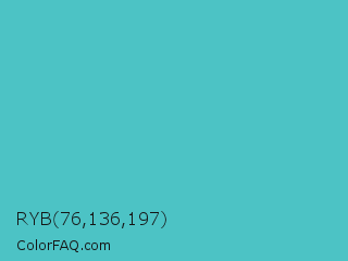 RYB 76,136,197 Color is a normal cyan color and the nearest color is Sea Serpent #4bc7cf. Hex code #4cc3c5 and RGB value is rgb(76,195,197). In RGB color space, this color is composed of 30% red, 76% green, 77% blue, In CMYK color space, this color is composed of 61% cyan, 1% magenta, 0% yellow , 23% black , In HSL color space, this color has a hue angle of 181° , 51% saturation and 54% lightness.