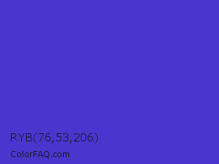 RYB 76,53,206 Color is a normal indigo color and the nearest color is Ocean Blue #4f42b5. Hex code #4c35ce and RGB value is rgb(76,53,206). In RGB color space, this color is composed of 30% red, 21% green, 81% blue, In CMYK color space, this color is composed of 63% cyan, 74% magenta, 0% yellow , 19% black , In HSL color space, this color has a hue angle of 249° , 61% saturation and 51% lightness.