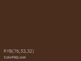 RYB 76,53,32 Color is a very dark orange color and the nearest color is Saddle #4c3024. Hex code #4c2e20 and RGB value is rgb(76,46,32). In RGB color space, this color is composed of 30% red, 18% green, 13% blue, In CMYK color space, this color is composed of 0% cyan, 39% magenta, 58% yellow , 70% black , In HSL color space, this color has a hue angle of 19° , 41% saturation and 21% lightness.