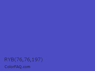 RYB 76,76,197 Color is a normal blue color and the nearest color is Iris #5a4fcf. Hex code #4c4cc5 and RGB value is rgb(76,76,197). In RGB color space, this color is composed of 30% red, 30% green, 77% blue, In CMYK color space, this color is composed of 61% cyan, 61% magenta, 0% yellow , 23% black , In HSL color space, this color has a hue angle of 240° , 51% saturation and 54% lightness.