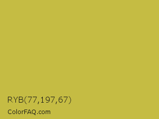 RYB 77,197,67 Color is a normal yellow color and the nearest color is Turmeric #cabb48. Hex code #c5bc43 and RGB value is rgb(197,188,67). In RGB color space, this color is composed of 77% red, 74% green, 26% blue, In CMYK color space, this color is composed of 0% cyan, 5% magenta, 66% yellow , 23% black , In HSL color space, this color has a hue angle of 56° , 53% saturation and 52% lightness.