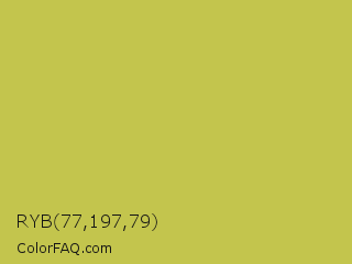 RYB 77,197,79 Color is a normal yellow color and the nearest color is Turmeric #cabb48. Hex code #c3c54d and RGB value is rgb(195,197,77). In RGB color space, this color is composed of 76% red, 77% green, 30% blue, In CMYK color space, this color is composed of 1% cyan, 0% magenta, 61% yellow , 23% black , In HSL color space, this color has a hue angle of 61° , 51% saturation and 54% lightness.