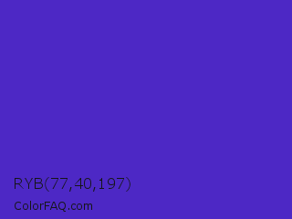 RYB 77,40,197 Color is a normal indigo color and the nearest color is Purple Heart Crayola #652dc1. Hex code #4d28c5 and RGB value is rgb(77,40,197). In RGB color space, this color is composed of 30% red, 16% green, 77% blue, In CMYK color space, this color is composed of 61% cyan, 80% magenta, 0% yellow , 23% black , In HSL color space, this color has a hue angle of 254° , 66% saturation and 46% lightness.