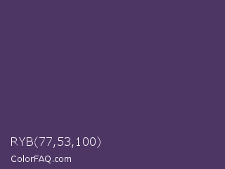 RYB 77,53,100 Color is a dark purple color and the nearest color is English Violet #563c5c. Hex code #4d3564 and RGB value is rgb(77,53,100). In RGB color space, this color is composed of 30% red, 21% green, 39% blue, In CMYK color space, this color is composed of 23% cyan, 47% magenta, 0% yellow , 61% black , In HSL color space, this color has a hue angle of 271° , 31% saturation and 30% lightness.