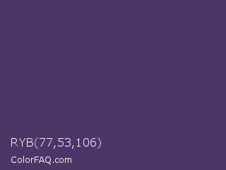 RYB 77,53,106 Color is a normal violet color and the nearest color is Mulled Wine #4e4562. Hex code #4d356a and RGB value is rgb(77,53,106). In RGB color space, this color is composed of 30% red, 21% green, 42% blue, In CMYK color space, this color is composed of 27% cyan, 50% magenta, 0% yellow , 58% black , In HSL color space, this color has a hue angle of 267° , 33% saturation and 31% lightness.