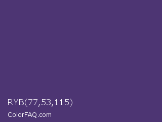 RYB 77,53,115 Color is a normal violet color and the nearest color is Regalia #522d80. Hex code #4d3573 and RGB value is rgb(77,53,115). In RGB color space, this color is composed of 30% red, 21% green, 45% blue, In CMYK color space, this color is composed of 33% cyan, 54% magenta, 0% yellow , 55% black , In HSL color space, this color has a hue angle of 263° , 37% saturation and 33% lightness.