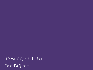 RYB 77,53,116 Color is a normal violet color and the nearest color is Regalia #522d80. Hex code #4d3574 and RGB value is rgb(77,53,116). In RGB color space, this color is composed of 30% red, 21% green, 45% blue, In CMYK color space, this color is composed of 34% cyan, 54% magenta, 0% yellow , 55% black , In HSL color space, this color has a hue angle of 263° , 37% saturation and 33% lightness.